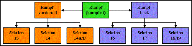 Der Flugzeugrumpf besteht aus den Teilrümpfen Rumpfvorderteil und Rumpfheck. Beide Abschnitte sind durch die Sektion mit dem Flügelkasten (Wingbox) voneinander getrennt. Ein Rumpfabschnitt entsteht aus mehreren Sektionen. So wird z.B. das Rumpfheck aus drei Sektionen zusammengesetzt.