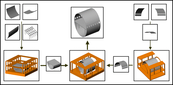 Die Abbildung zeigt den schematischen Ablauf des Sektionsbaus. In einem Bauplatz wird die untere Halbsektion aus 3 Teilschalen und dem Fußbodenrost zusammengefügt. Analog dazu findet die Montage der oberen Halbsektion in einem anderen Bauplatz statt. Aus beiden Halbsektionen entsteht die komplette Sektion in einem Zusammenbauplatz.