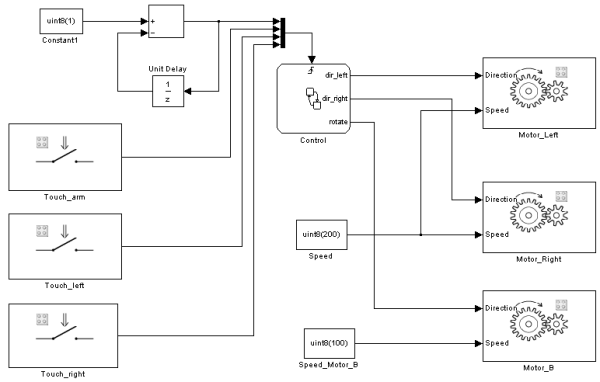 The outputs from the model come from two device driver blocks, Motor_right and Motor_left. Motor_right and Motor_left blocks are characterised by the direction and speed values. The speed value is an unsigned 8-bit constant setting in Speed block. The unsigned 8-bit directional value is either 1 (forward), 2 (backward), 3 (brake) or 0 (stop). Maximum number of output blocks is three.