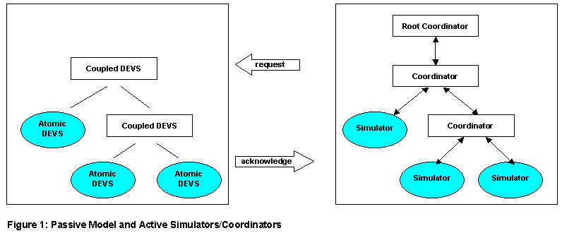 With each atomic DEVS model a simulator, with each coupled DEVS a coordinator is associated.