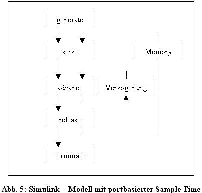2.2 S - Funktionen mit portbasierter Sample Time Beim Ansatz mit einer portbasierten Sample Time stößt ein Block einen anderen Block an, dabei entsteht eine treibende Simulation. Der generate Block hat die Aufgabe die Simulation anzutreiben. Der Block Verzögerung bekommt die Verweildauer der Transaktion vom advance Block übergeben und stößt diesen nach Ablauf der Verweildauer erneut an. Die Rückkoppelung von release zu seize bewirkt das erneute Anstoßen von seize. Damit wird seize bekannt gemacht, dass die Einrichtung wieder frei ist, die zuvor durch seize belegt wurde. Um einen Algebraic Loop in Simulink zu verhindern wird der Memory Block genutzt. Der Memory Block bewirkt eine von Max step size abhängige Verzögerung. Ein Anstoßen der nachfolgender Blöcke ist in Simulink nicht realisierbar. Wird ein Block mit portbasierter Sample Time angestoßen werden alle Ausgänge diese Blockes aktiviert, was zufolge hat das ein nachfolgender Block mit portbasierter Sample Time ebenfalls angestoßen wird. Dies stellt ein Problem dar, wenn ein Block mit portbasierte Sample Time aufgrund einer Bedingung nicht aktiviert werden darf. |