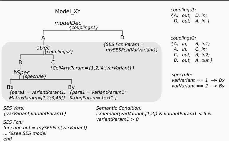 This example shows, how you can assign parameters (attributes) to entity nodes. Furthermore, it shows how to deal with complex calculations by using SES Functions. The SES in this example has the same structure as the SES in example 2, but it specifies additional attributes at entity nodes using SES Variables and SES Functions.
