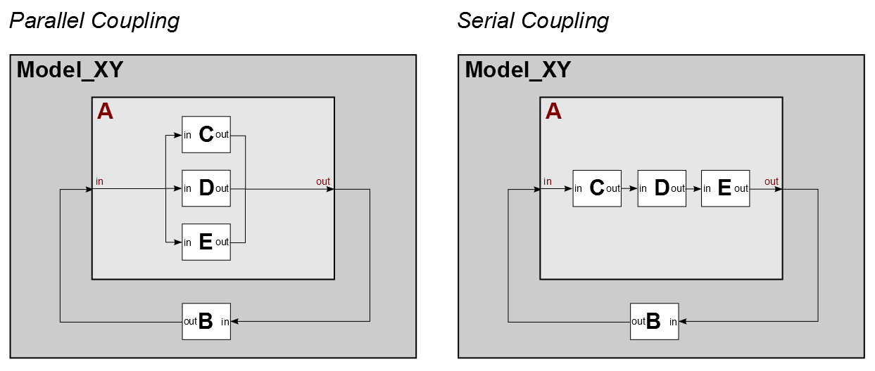 Although, this SES possess no decision nodes, it still defines 2 different system variants for the CM A, one with a parallel coupling structure and the other with a serial coupling structure.