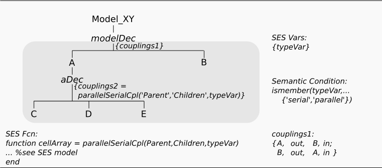 We define the SES Variable "typeVar" to control the selection of a specific coupling structure for CM A. If the value of "typeVar" is equal to "parallel", the parallel coupling structure shall be selected and if it is equal to "serial", the serial coupling structure shall be selected. We also define a Semantic Condition for this SES Variable.