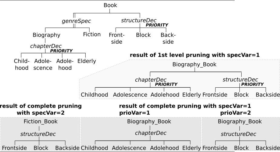The inheritance axiom says that the parent entity and a selected child entity of a Specialization unify there names, attributes and there Aspects(!!!). That means for this example, when the Specialization node "genreSPEC" is resolved during pruning with the child entity "Biography", the entity "Book" inherits the Aspect "chapterDEC" as its next child. You can check it out by using the First-Level-Pruning operation. When you start this pruning operation you may see that there is a decision problem. The nodes "chapterDEC" and "structureDEC" are now in the same level and because they are siblings they form a decision (see figure). This kind of decision can be solved by setting the Priority property defined at Aspects.
